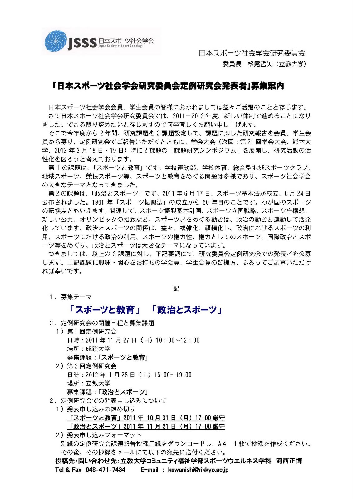 さて日本スポーツ社会学会研究委員会では、2011-2012年度、新しい体制で進めることになりました。できる限り努めたいと存じますので何卒宜しくお願い申し上げます。