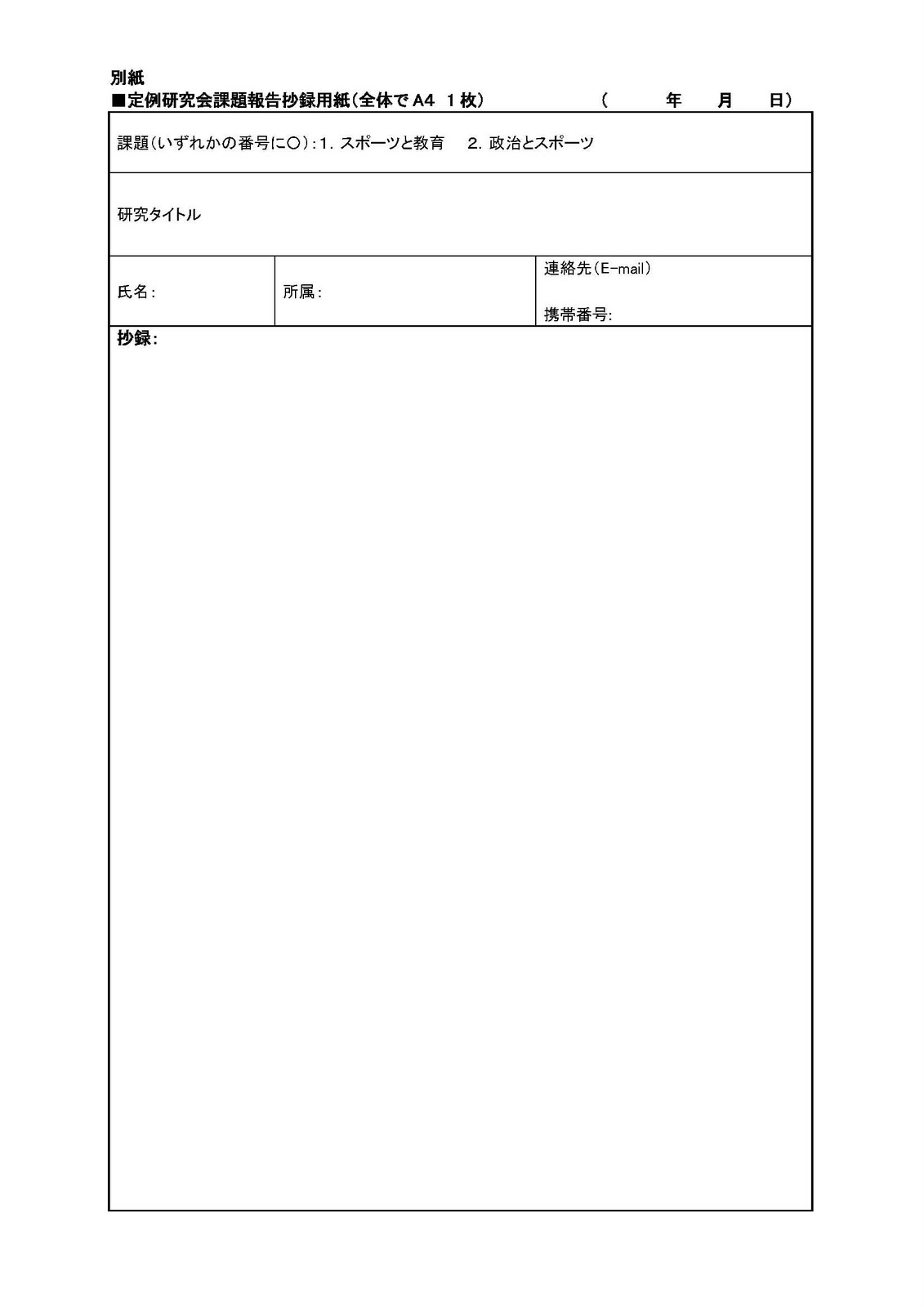 別紙の定例研究会課題報告抄録用紙をダウンロードし、A4 1枚で抄録を作成ください。